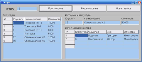 Для осуществления поиска в поле Edit4 (Поиск) надо ввести ID услуги, по которой необходимо просмотреть полную информацию. По нажатию кнопки Button1 (Просмотреть) в область GroupBox2 (Информация по услуге) выводится вся известная информация: в поле Edit1 - ID услуги, в поле Edit2 - наименование услуги, в поле Edit3 - стоимость. В таблицу StringGrid2 (Исполняющие мастера) выводится информация по всем мастерам, исполняющие данную услугу: ID мастера, фамилия, имя, отчество мастера.