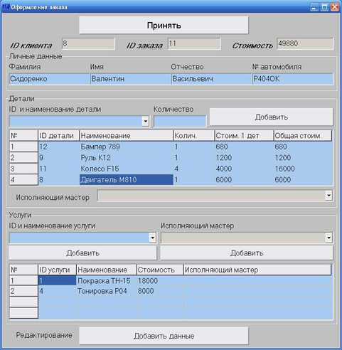 При оформлении заказа заполняются только голубенькие поля, серые поля заполняются при редактировании (принятии заказа на выполнение). Поля Edit9 (ID клиента), Edit1 (ID заказа), Edit2 (Стоимость) заполняются после создания нового заказа, т.е. после добавления данных в таблицы. Кнопка Button1 (Принять) добавляет все введённые данные в соответствующие таблицы. В поля Edit3 (Фамилия), Edit4 (Имя), Edit5 (Отчество), Edit6 (№ автомобиля) содержат информацию о клиенте и, если клиент найден в БД, заполняются автоматически.