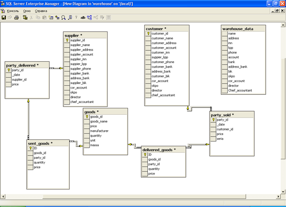 Диаграмма “Сущность-связь” (ER-диаграмма) разработана на основе анализа предметной области и представлена на рис. 4, выполненная с помощью CASE-средств MS SQL Server 2000.