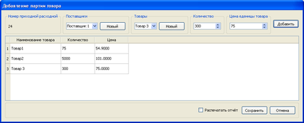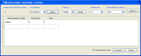 На форме находятся элементы ввода для выбора поставщика, товара, его стоимости и количества. Если усановленя опция «Распечатать отчёт», то после нажатия кнопки «Сохранить» открывается форма предварительного просмотра и приходной накладной, с возможностью последующей печати. В группах «Поставщики» и «Товары» присутствуют кнопки «Новый» при нажатии на которые открываются диалоги для добавления новых поставщиков.