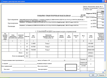 Товарно транспортная накладная печатается на бланке типовой межотраслевой формы №1-Т, утвержденной постановлением Госкомстата России от 28.11.97 №78. Кнопка «Печатать» служит для распечатки накладной, кнопка «PDF» служит для экспорта в формат pdf.