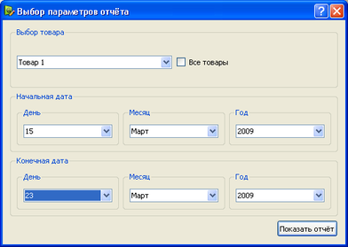 Форма предназначена для ввода параметров отчёта о количестве и стоимости товаров, поступивших и выбывших со склада за период с начальной даты по конечную дату. После нажатия на кнопку «Показать отчёт» открывается диалоговое окно просмотра отчёта с возможностью последующей распечатки.