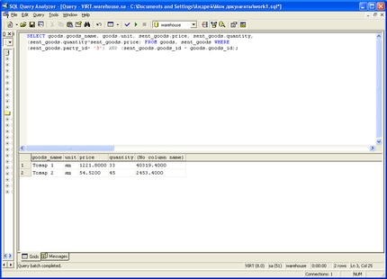SELECT goods.goods_name, goods.unit, sent_goods.price, sent_goods.quantity, (sent_goods.quantity*sent_goods.price) FROM goods, sent_goods WHERE (sent_goods.party_id= '1') AND (sent_goods.goods_id = goods.goods_id);