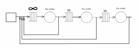 Также существует возможность перехода сообщения с Серверов в очередь Queue1 с вероятностями P1, P2, P3.