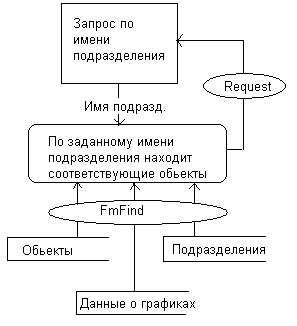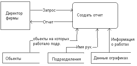 Директору предприятия нужно увидеть график работ определенного подразделения на объектах с которыми работает фирма в течении месяца. Он дает запрос в виде его названия , также требуется задать месяц и год выполнения работ. Далее формируется отчет о объектах обслуживаемых данным подразделения и ответственных за выполнение работ.