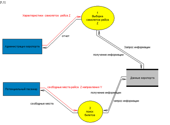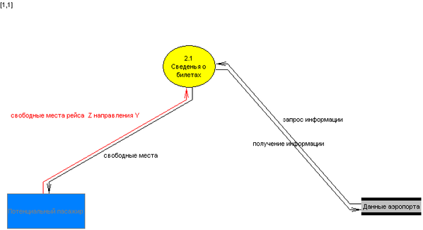 1. Добавим процесс в нашу DFD диаграмму 1 уровня, процесс называем «Сведенья о билетах » (сведенья о наличии свободных мест на рейс Z направления Y)) .