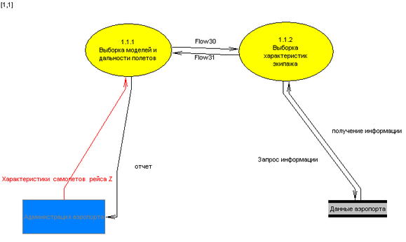 3. Создаем поток данных от процесса «выборка моделей и дальности полетов» к внешней сущности «Администрация аэропорта», и изменяем его имя на «Отчет», т.е. результат в виде списка всех моделей самолетов, летающих по этому рейсу, а так же их бортовых номеров и летных характеристик (дальность полета), номер экипажа и фамилия командира самолета с номером N.