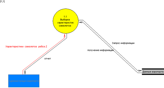Создаем поток данных от процесса «Выборка самолетов рейса» к внешней сущности «Администрация аэропорта», и изменяем его имя на «Отчет», т.е. результат в виде списка всех моделей самолетов, летающих по этому рейсу, а так же их бортовых номеров и летных характеристик (дальность полета).
