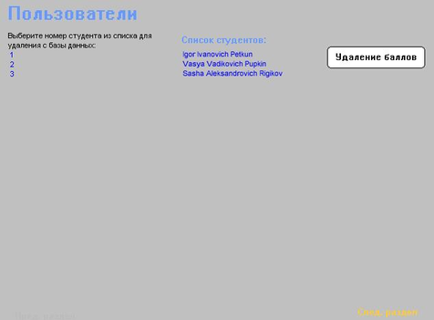 В этом режиме программа выводит список пользователей с возможностью удаления любой записи или отчистки очков у любого пользователя (Рис.7).