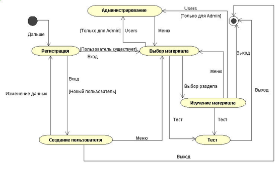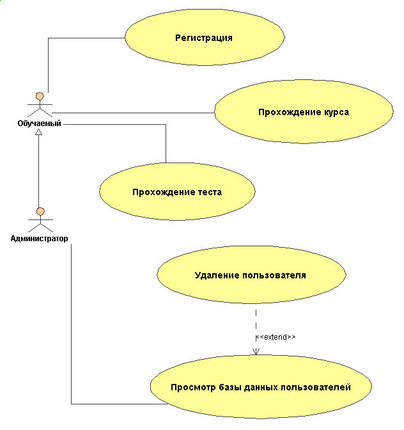На диаграмме использования (Рис.3) изображены возможные действия обычного пользователя и администратора. Пользователь может изучить курс, а также пройти тест. Администратор кроме этих действий может также редактировать базу данных пользователей.