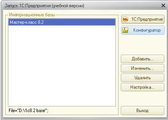 В результате в списке информационных баз мы увидим нашу новую базу - Мастер-класс 8.2. Останется лишь нажать на кнопку Конфигуратор, чтобы начать создание нашей "программы".