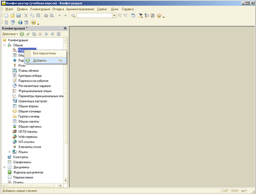 Подсистемы располагаются в ветке Общие - Подсистемы. Добавим подсистему.