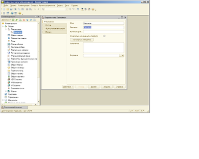 Справа откроется отдельное окно (окно редактирования объекта конфигурации) с параметрами создаваемой подсистемы - зададим имя подсистемы- Контакты. Синоним система 1С предприятие добавит сама, после того, как мы нажмем клавишу Ввод в поле Имя. Больше пока в открытом окне ничего менять не будем, поэтому нажмем кнопку Закрыть.