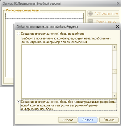 Но мы с вами не устанавливали никаких шаблонов, поэтому снова согласимся с тем, что стандартно предлагает нам система - создать информационную базу без конфигурации (то есть без "программы") и просто нажмем Далее >.