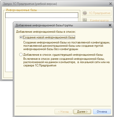 Вот теперь система поинтересуется, а что же именно мы хотим добавить в список наших баз: совсем новую информационную базу, которой еще нет, или же информационную базу, которая уже существует где-то (например, на каком-нибудь сервере в локальной сети...)