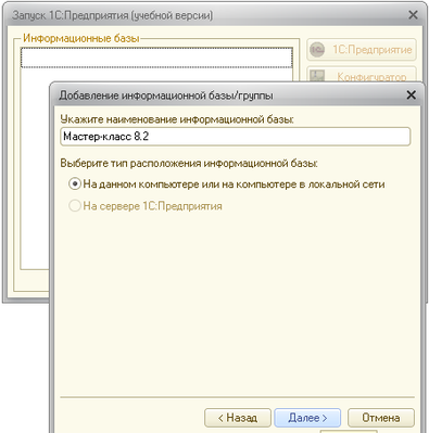 Теперь система поинтересуется, как будет называться наша новая информационная база. Название можно дать любое, оно ни на что не влияет, но лучше назвать ее Мастер-класс 8.2. Именно это название будет отображаться в списке информационных баз, который открывается при запуске системы. Нажмем Далее >.