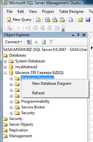 Для создания диаграммы находим свою БД, раскрываем ее, щелкаем правой кнопкой на вкладку «Database Diagrams» и нажимаем «New Database Diagram»