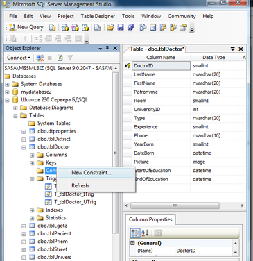 Так для таблицы «tblDoctor» можно отследить, что идентификатор доктора я будет всегда числом положительным. Для этого находим нужную таблицу, раскрываем ее, щелкаем правой клавишей мыши по вкладке «Constraint» и нажимаем «New Constraint» Указываем имя ограничения.