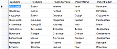 SELECT dbo.tblPacient.PacientSurname, dbo.tblPacient.PacientName, dbo.tblPacient.PolicyNumber, dbo.tblDoctor.LastName, dbo.tblDoctor.FirstName
