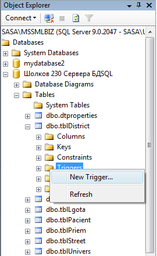 Для создания тригера находим нужную нам таблицу, раскрываем ее, щелкаем правой кнопкой на вкладку «Triggers» и нажимаем «New Trigger»: