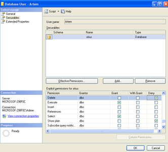 Пользователю ILYA разрешим просмотр и выполнение хранимых процедур и запретим удаление и изменение. Пользователю Admin разрешены любые действия.