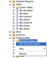 Для создания хранимой процедуры находим нужную нам базу данных, раскрываем ее, щелкаем правой кнопкой на вкладку «Programmability»,там находим вкладку «Stored Procedures» и нажимаем «New Stored Procedure»: