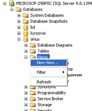 Для создания представления находим нужную нам базу данных, раскрываем ее, щелкаем правой кнопкой на вкладку «Views» и нажимаем «New View»: