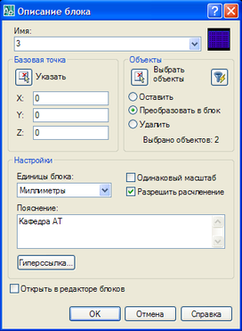 выделяем нужные элементы чертежа для объединения, нажимаем Enter и возвращаемся в то же окно. Пишем название блока и выбираем "Преобразовать в блок" в опциональной кнопке, при необходимости добавляем свои комментарии.