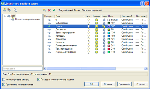 Для создания и изменения слоёв необходимо выполнить команду "Формат-Слой" либо нажать соответствующую пиктограмму на панели инструментов. В результате откроется окно "Диспетчер свойств слоёв"