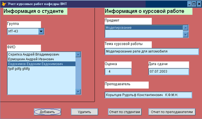 Данная форма «Учет курсовых работ кафедры ВИТ» содержит информацию о студенте и о курсовой работе. Для получения необходимой информации, в списке «Группа» выбираем любую группу кафедры ВИТ. После выбора группы в поле «ФИО» появляются все студенты, принадлежащие данной группе. При выборе студента происходит вывод информации предмете: в списке «Предмет» появляется название предмета (или предметов), по которому проводится курсовая работа. При дальнейшем выборе предмета из списка происходит заполнение следующей информации о курсовой работе: тема курсовой работы, оценка, дата сдачи и преподаватель.