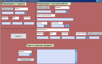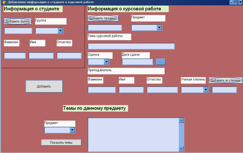 При нажатии на кнопку «Добавить» появляется форма «Добавление информации о студенте и курсовой работе» с пустыми полями, в которые необходимо заполнить, чтобы занести информацию о студенте и о его курсовой работе в нашу базу данных: