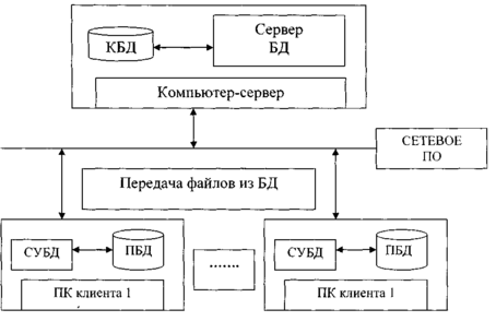 БД в этом случае помещается на сетевом сервере, как и в архитектуре "файл-сервер", однако прямого доступа к базе данных (БД) из приложений не происходит. Функция прямого обращения к БД осуществляет специальная управляющая программа - сервер БД (SQL-сервер), поставляемый разработчиком СУБД.