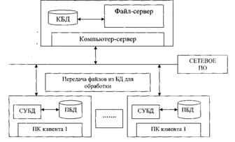 Архитектура "файл-сервер" предусматривает концентрацию обработки на рабочих станциях. Основным преимуществом этого варианта является простота и относительная дешевизна. Подобное решение приемлемо, пока число пользователей, одновременно работающих с базой данных, не превышает 5-10 человек. При увеличении количества пользователей система может "захлебнуться" из-за перегруженности ЛВС большими потоками необработанной информации.