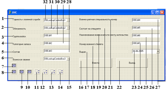 | 24 | DBEdit7. | Data Field - Номер военного билета; Data Sourse - DataSource1 | Data Sourse - DataSource1 |