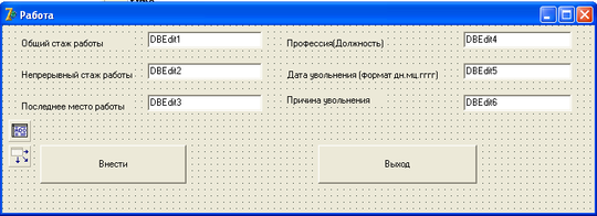 | 8 | DBEdit2 | Data Field - Непрерывный стаж работы; Data Sourse - DataSource1. | Data Sourse - DataSource1. OnKeyPress - Edit2KeyPress; |