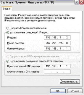 В данном случае, маршрутизатор по умолчанию имеет IP адрес 192.168.1.1 , а значит сетевому интерфейсу компьютера был автоматически присвоен IP адрес 192.168.1.2, можно три, можно четыре в конце адреса, главное что бы не было двух одинаковых адресов в сети. Нажимаем пуск - сетевые подключения, подключения по локальной сети, свойства, протокол Интернета (TCP/ IP), и опять свойства. На экране появится окно, где и нужно прописать настройки (рис.8). В качестве DNS сервера и шлюза необходимо указать адрес маршрутизатора. То есть 192.168.1.1, в данном случае.