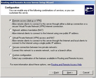 На данном сервере уже работает общий доступ к файлам и создан Web-сервер. Поэтому роли Файл-сервер и Сервер приложений отмечены как настроенные. В проведенном списке нас интересует строка Сервер удаленного доступа или VPN-c. Выбрав этот пункт, нажимаем кнопку Далее. Появится окно с информацией о том, что после нажатия кнопки Далее будет запущен мастер настройки маршрутиризации и удаленного доступа. Нажимаем кнопку Далее.