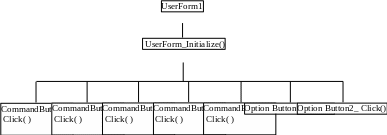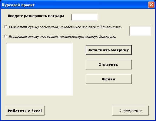 В данной диаграмме UserForm_Initialize() – процедура инициализации пользовательской формы. CommandButton1_Click() – процедура, срабатывающая при нажатии кнопки «Заполнить матрицу», которая производит проверку правильности ввода размерности матрицы, заполнение матрицы и вывод её на пользовательскую форму. CommandButton2_Сlick() – процедура, срабатывающая при нажатии кнопки «Очистить», которая очищает форму. CommandButton3_Сlick() – процедура, срабатывающая при нажатии кнопки «Выйти», позволяющая пользователю завершить работу с программой. CommandButton4_Click() – процедура, срабатывающая при нажатии кнопки «О программе», которая даёт краткие сведения о программе и её разработчике. CommandButton5_Сlick() – процедура, срабатывающая при нажатии кнопки «Работать с Excel», позволяющая пользователю переключиться на работу с листом Excel. OptionButton1_Click() – процедура-переключатель, при выборе которого вычисляется сумма элементов, находящихся под главной диагональю. OptionButton2_Click() – процедура-переключатель, при выборе которого вычисляется сумма элементов, составляющих главную диагональ.