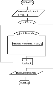 еобходимый результат получается при суммировании элементов в следующем порядке: а21 + а31 + а32 +…+ аi1 + ai2 + ai3 + ai(j-1) – суммируются элементы, начиная со второй строки, и, при увеличении строки на 1, число столбцов, содержащих нужные элементы, также увеличивается на 1. В кратком виде этот цикл выглядит так: i=f…m, где начальное f=2; j=1…(m-b), где начальное b=m-1. При каждой последующей итерации значение f увеличивается на 1, а значение b на 1 уменьшается.