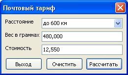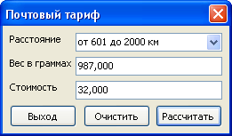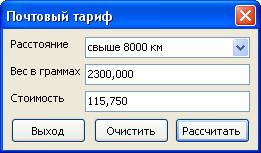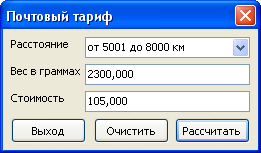 Созданный программный продукт позволяет решить поставленную задачу. Т.е., в результате стоимость почтового тарифа определяется в зависимости от тарифного пояса и веса бандероли.