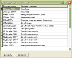 Команда «Справочник Праздников», вызывает окно содержащее сведения о государственных праздниках, предоставляющее возможность добавления или изменения данных о дате празднования. Окно представлено на Рисунке 7.6