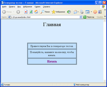 Главная страница, содержит приветственное слово и кнопку-ссылку для перехода на следующую страницу и начала теста.