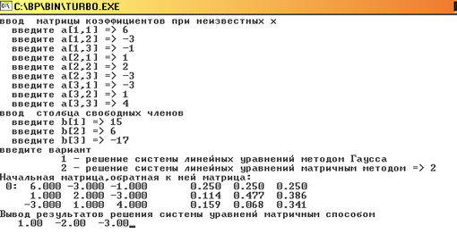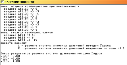 В зависимости от выбранного вариант в программе происходит решение системы уравнений методом Гаусса (рис.2) или матричным методом (рис.3) с выдачей на экран результатов: