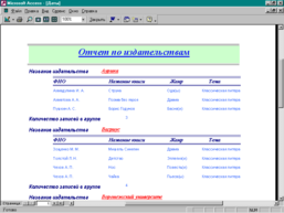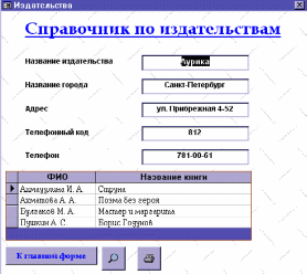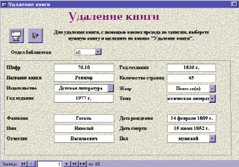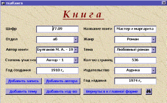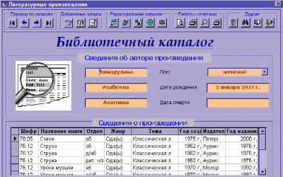 И нажимаем кнопку «Добавить книгу». Из списка «Автор книги» выбираем, Крылов И.А. Аналогично заполняются другие поля формы «Добавление книги», а затем нажимаем кнопку «Добавить запись». Далее в форме «Литературные произведения» можно просмотреть информацию об этой книге.