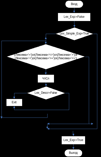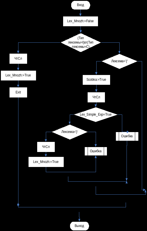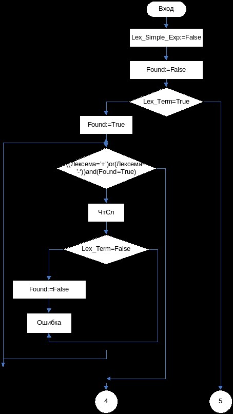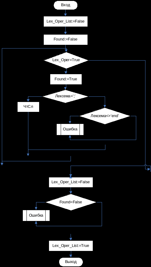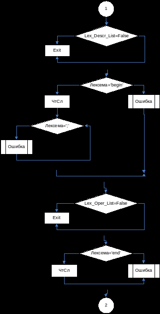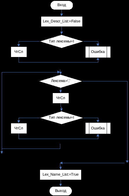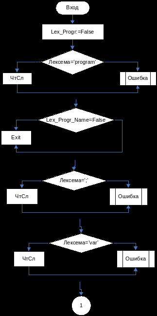 while (Id_tab [hesh]. lex<>'') and (hesh begin Id_tab [hesh]. ssylka: =hesh+1; hesh: =hesh+1; end; Id_tab [hesh]. nomer: =Numid; // запись данных Id_tab [hesh]. lex: =str; end; function Search_Ident (str: string): integer; // функция поиска терминала var i: integer; label 1; begin kod: =Length (str) +2; hesh: =0; for i: =1 to Length (str) do hesh: =hesh+ord (str [i]); // вычисление хэш hesh: =round (hesh/kod); 1: if str=Id_tab [hesh]. lex then Search_Ident: =Id_tab [hesh]. nomer else // поиск идентификатора begin if Id_tab [hesh]. ssylka=0 then Search_Ident: =0 else begin hesh: =Id_tab [hesh]. ssylka; goto 1; end; end; end; procedure Search_Const (Curr_term: integer; str_lex: string); // Процедура поиска лексем в дереве идентификаторов begin Constyes: =0; // флаг: найдена ли лексема if (NumConst<>0) and (str_lex<>'') then begin if (CompareStr (Const_tab [Curr_term]. value,str_lex) >0) and (Const_tab [Curr_term]. Left<>0) then Search_Const (Const_tab [Curr_term]. Left,str_lex); // рекурсивный "спуск по дереву" if (CompareStr (Const_tab [Curr_term]. value,str_lex) <0) and (Const_tab [Curr_term]. Right<>0) then Search_Const (Const_tab [Curr_term]. Right,str_lex); if Const_tab [Curr_term]. value=str_lex then Constyes: =Const_tab [Curr_term]. nomer; end; end; procedure Search_Term (Curr_term: integer; str_lex: string); // Процедура поиска лексем в дереве идентификаторов begin Termyes: =0; // флаг: найдена ли лексема if (NumTerm<>0) and (str_lex<>'') then begin if (CompareStr (Term_tab [Curr_term]. lex,str_lex) >0) and (Term_tab [Curr_term]. Left<>0) then Search_Term (Term_tab [Curr_term]. Left,str_lex); // рекурсивный "спуск по дереву" if (CompareStr (Term_tab [Curr_term]. lex,str_lex) <0) and (Term_tab [Curr_term]. Right<>0) then Search_Term (Term_tab [Curr_term]. Right,str_lex); if Term_tab [Curr_term]. lex=str_lex then Termyes: =Term_tab [Curr_term]. nomer; end; end; // функция распознавания 16-рич. констант function FConst (str: string): integer; var sost: byte; begin sost: =0; if str [1] ='$' then // распознаём символ '$' begin sost: =1; delete (str,1,1); end else exit; if (str [1] ='+') or (str [1] ='-') then // распознаём знак begin sost: =2; delete (str,1,1) end else begin sost: =4; exit; end; if str='' then exit; while length (str) >0 do begin if (str [1] in cifra) or (str [1] in bukva) then sost: =2 // распознаём буквы или цифры else begin sost: =4; exit; end; delete (str,1,1); end; sost: =3; if sost=3 then FConst: =1 else FConst: =-1; end; function termin: integer; // распознаватель терминальных символов begin termin: =-1; for k: =1 to 14 do if Words [k] =Lexem then termin: =3; for k: =1 to 8 do if Razdel [k] =Lexem then termin: =1; for k: =1 to 11 do if Operacii [k] =Lexem then termin: =2; end; function Rome (str: string): integer; // распознаватель римских констант var sost: byte; begin sost: =0; if (str [1] ='-') or (str [1] ='+') then begin sost: =12; delete (str,1,1); end; if str='' then exit; if str [1] ='X' then begin sost: =1; delete (str,1,1) end else begin if str [1] ='V' then begin sost: =2; delete (str,1,1) end else begin if str [1] ='I' then begin sost: =3; delete (str,1,1) end else begin sost: =4; exit; end; end; end; while Length (str) <>0 do begin case sost of 1: if str [1] ='X' then begin sost: =5; delete (str,1,1) end else begin if str [1] ='V' then begin sost: =2; delete (str,1,1) end else begin if str [1] ='I' then begin sost: =3; delete (str,1,1) end else begin sost: =4; exit; end; end; end; 2: if str [1] ='I' then begin sost: =7; delete (str,1,1) end else begin sost: =4; exit; end; 3: if str [1] ='X' then begin sost: =8; delete (str,1,1) end else begin if str [1] ='V' then begin sost: =9; delete (str,1,1) end else begin if str [1] ='I' then begin sost: =10; delete (str,1,1) end else begin sost: =4; exit; end; end; end; 4: exit; 5: if str [1] ='X' then begin sost: =6; delete (str,1,1) end else begin if str [1] ='V' then begin sost: =2; delete (str,1,1) end else begin if str [1] ='I' then begin sost: =3; delete (str,1,1) end else begin sost: =4; exit; end; end; end; 6: if str [1] ='V' then begin sost: =2; delete (str,1,1) end else begin if str [1] ='I' then begin sost: =3; delete (str,1,1) end else begin sost: =4; exit; end; end; 7: if str [1] ='I' then begin sost: =10; delete (str,1,1) end else begin sost: =4; exit; end; 8: begin sost: =4; exit; end; 9: begin sost: =4; exit; end; 10: if str [1] ='I' then begin sost: =11; delete (str,1,1) end else begin sost: =4; exit; end; 11: begin sost: =4; exit; end; end; end; if (sost=4) or (sost=12) then Rome: =-1 else Rome: =1; end; // функция распознавания идентификаторов function Ident (str: string): integer; var sost: byte; begin sost: =0; // реализация конечного автомата if str [1] in ['a'. 'z'] then begin sost: =1; delete (str,1,1) end else exit; while length (str) >0 do begin if str [1] in ['a'. 'z','0'. '9','_'] then begin sost: =1; delete (str,1,1); end else begin sost: =3; exit; end; end; sost: =2; if sost=2 then ident: =1 else ident: =-1; end; procedure WriteCode (nomer: integer; lex: string; typ: char; num: integer); // запись в таблицу кодов лексем begin Code_Tab [NumLex]. nomer: =nomer; Code_Tab [NumLex]. Lex: =lex; Code_Tab [NumLex]. typ: =typ; Code_Tab [NumLex]. Num: =num; Code_Tab [NumLex]. numstr: =string_counter+1; end; procedure WriteLex (typelex: char); // запись лексем в таблицы begin case typelex of 'C': begin // если лексема-16-рич. константа NumLex: =NumLex+1; Search_Const (1,Lexem); if Cons