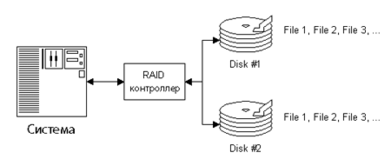 Дисковый массив с зеркалированием (Mirroring & Duplexing) (Рисунок 7). Дисковый массив с дублированием информации (зеркалированием данных). В простейшем случае два накопителя содержат одинаковую информацию и являются одним логическим диском. При выходе из строя одного диска его функции выполняет другой. Для реализации массива требуется не меньше двух винчестеров.