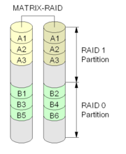 Matrix RAID – это технология, реализованная фирмой Intel в своих чипсетах начиная с ICH6R (Рисунок 13). Строго говоря, эта технология не является новым уровнем RAID (ее аналог существует в аппаратных RAID-контроллерах высокого уровня), она позволяет, используя небольшое количество дисков организовать одновременно один или несколько массивов уровня RAID 1, RAID 0 и RAID5. Это позволяет за сравнительно небольшие деньги обеспечить для одних данных повышенную надёжность, а для других высокую скорость доступа.
