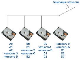 Этот уровень подходит для приложений с файлами большого объема и малой частотой обращений (в основном это сфера мультимедиа). Использование только одного диска для хранения контрольной информации объясняет тот факт, что коэффициент использования дискового пространства достаточно высок (как следствие этого – относительно низкая стоимость). Для реализации массива требуется не меньше трех винчестеров.