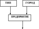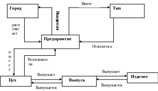 Корневыми являются сразу два типа Тип и Город, которые в свою очередь имеют свои подчиненные типы. Тип, как и Город имеет подчиненный тип Предприятие, тогда как Предприятие имеет подчиненный тип Цех. Тип Цех, в свою очередь имеет подчиненный тип Изделие. К достоинствам ИМД относят эффективное использование памяти ЭВМ и неплохие показатели времени выполнения основных операций над данными. А именно: поиск указанного экземпляра БД, переход от одного дерева к другому, переход от одной записи к другой внутри дерева, вставка новой записи в указанную позицию, удаление текущей записи. ИМД удобна для работы с иерархически упорядоченной информацией. Недостатком ИМД является ее громоздкость для обработки информации с достаточно сложными логическими связями, а также сложность понимания для обычного пользователя.