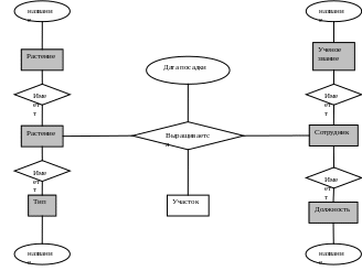 Исходя из моей предметной области, я выделила следующие объекты: «Растения», «Сотрудники», «Участки», «Должности», «Ученые звания», «Типы растений», «Семейства». Каждый объект имеет некоторые свойства. Объект «Растения» имеет свойство: «название», «тип», «семейство»; объект «Сотрудники» имеет свойства: «ФИО», «дата рождения», «должность», «стаж работы», «ученое звание»; У объекта «Участки» есть свойства: «номер», «название»; У объекта «Должности» свойство: «название»; Объект «Ученые звания» имеет свойство: «название»; Объект «Типы растений» имеет свойство «название»; объект «Семейства» имеет свойство «название».